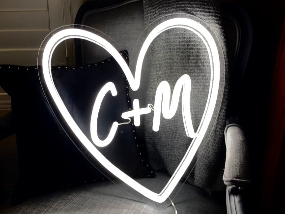 Customising your initials into a neon sign is simple and striking. This is our most cost conservative wedding neon sign but it doesn’t compromise on effect. Go a step further like we have below and place those initials inside a love heart. This will later look stunning displayed in your bedroom.