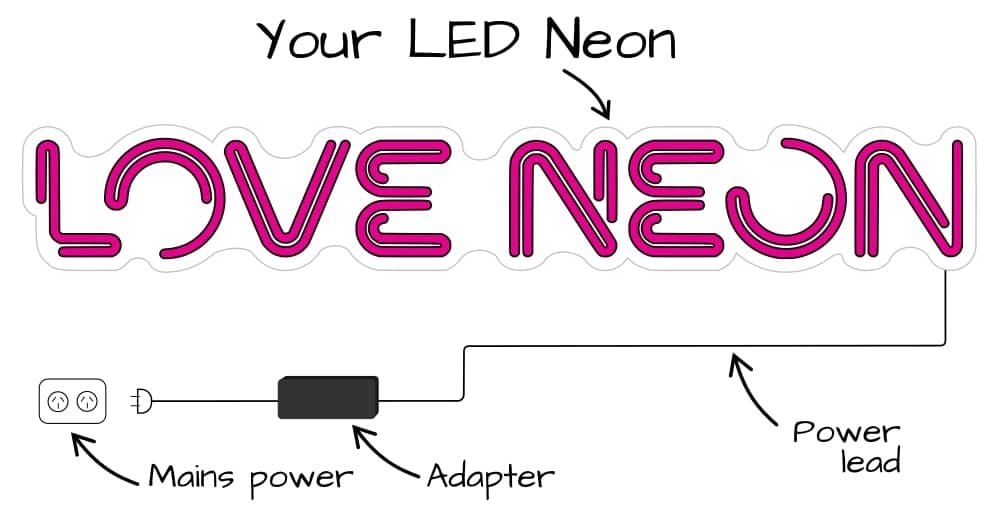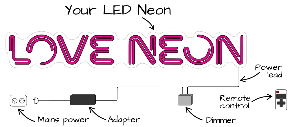 Signs are fitted with 2m of transparent power cord, and accompanied with remote control dimmer, plug & power adapter suitable for your region.