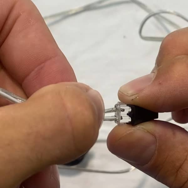 - Take hold of the connector clip in one hand and the protruding wires in the other. Give them a wriggle to test and make sure the latch remains closed.